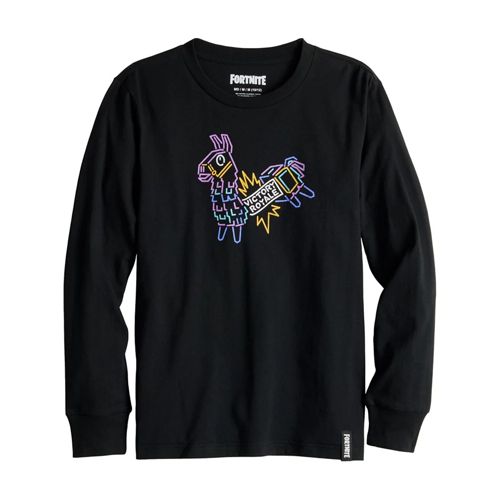 He’ll love showing off his personal style with this boys’ Fortnite Late Night Pinata Llama Victory Royale Video Game Long Sleeve Graphic Tee.