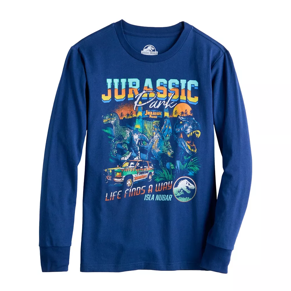 He’ll love showing off his personal style with this boys’ Jurassic Park Life Finds A Way Isla Nubar Dinosaur Long Sleeve Graphic Tee.