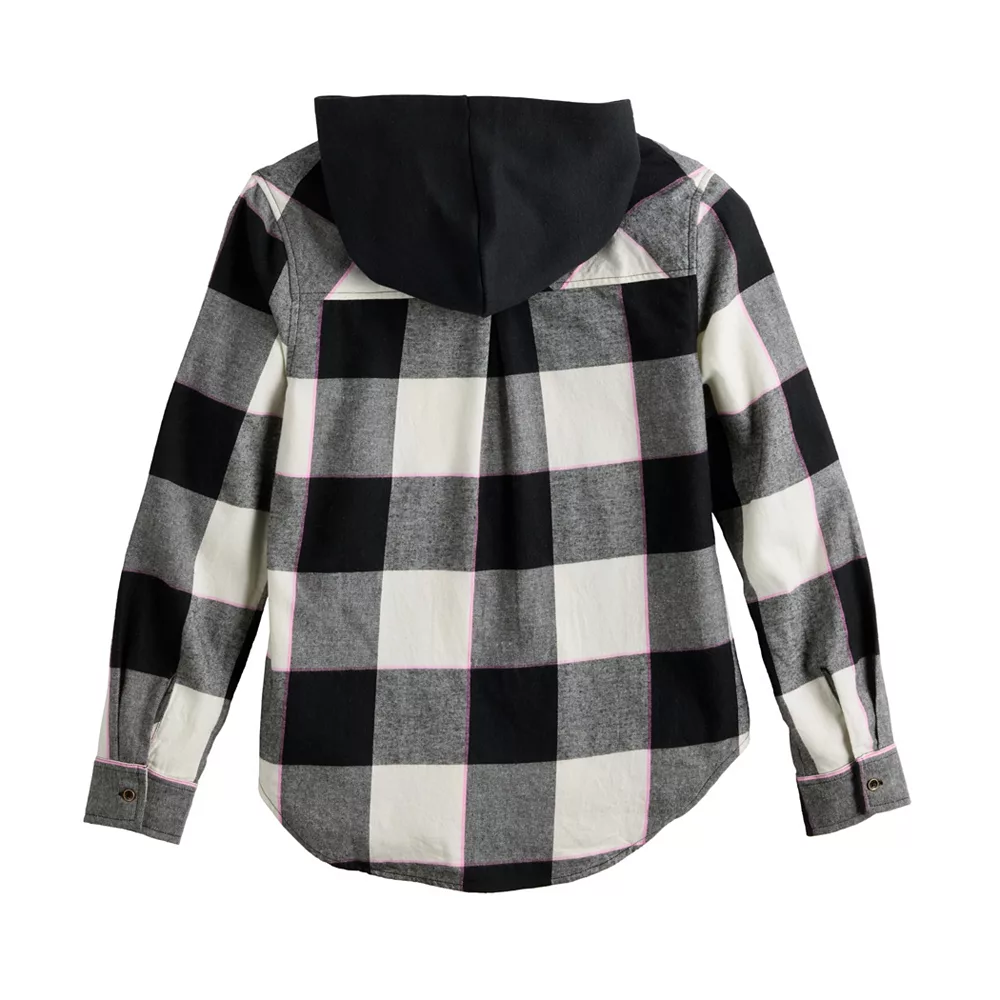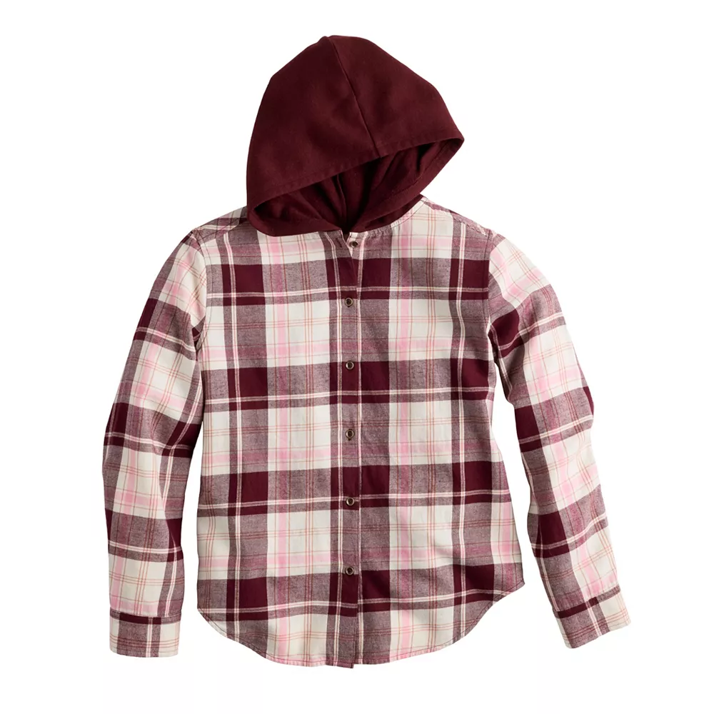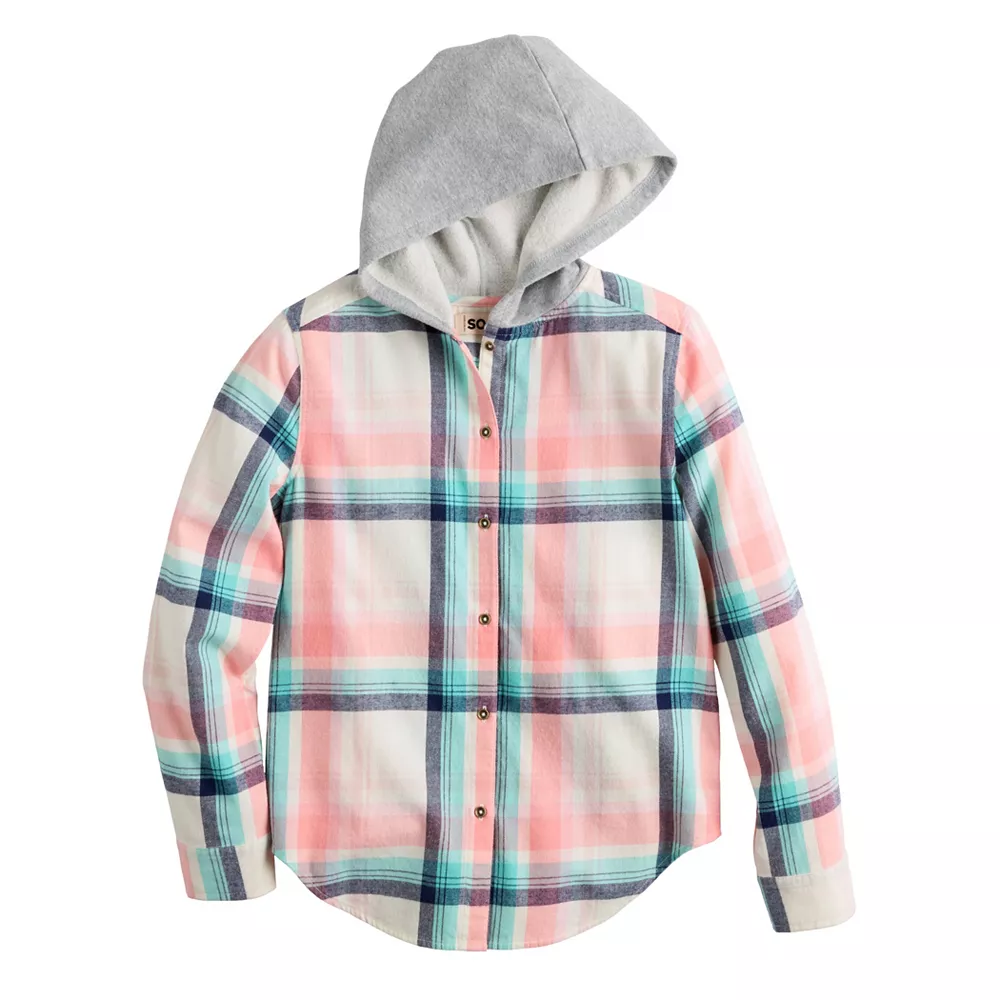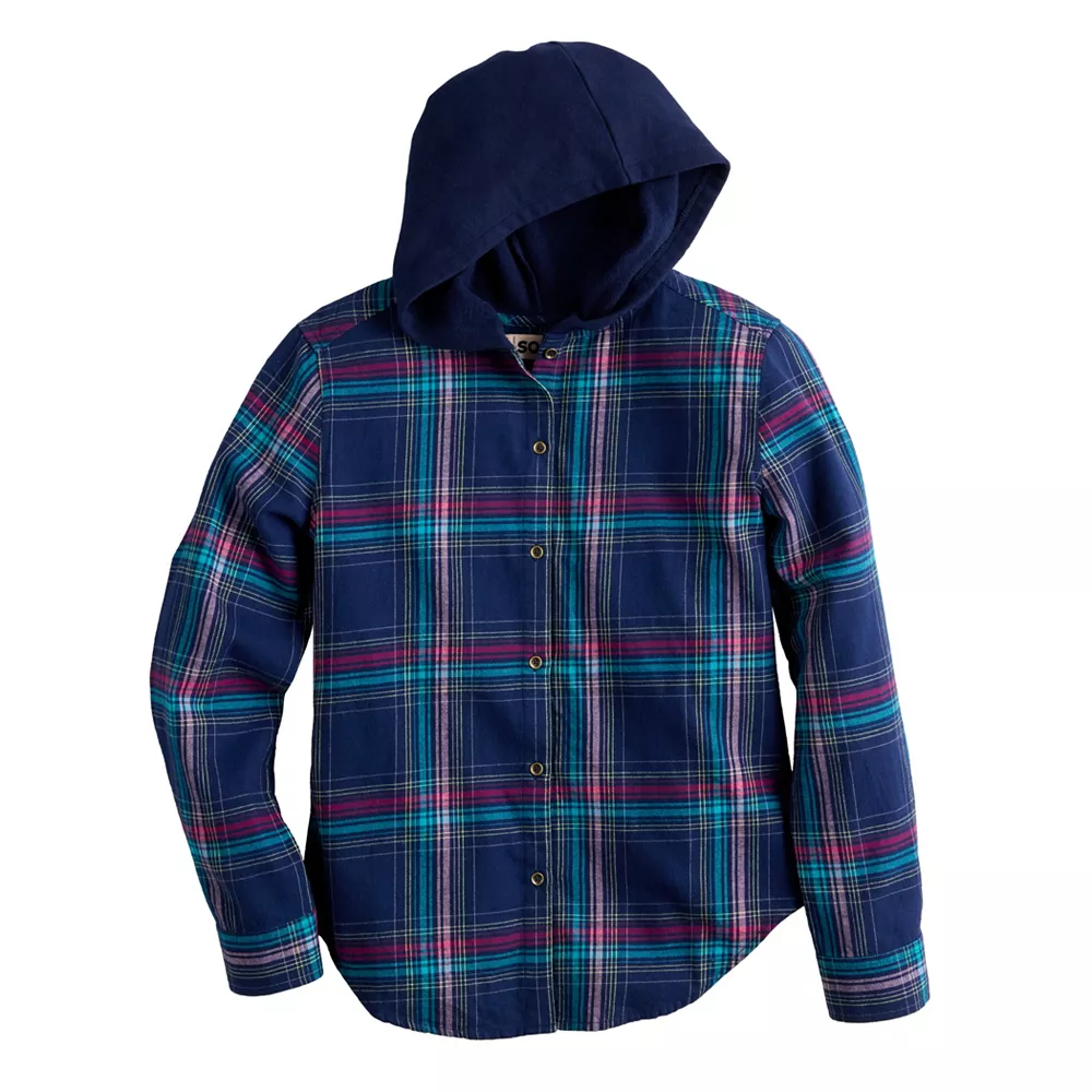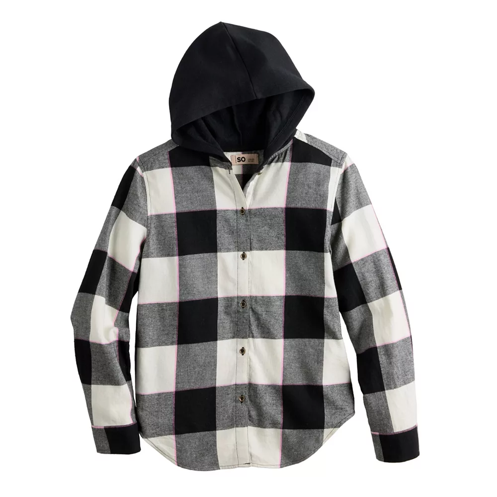 Perfect for cozy comfort on cooler days, she’ll love the look of this girls’ SO boyfriend hooded flannel shirt.