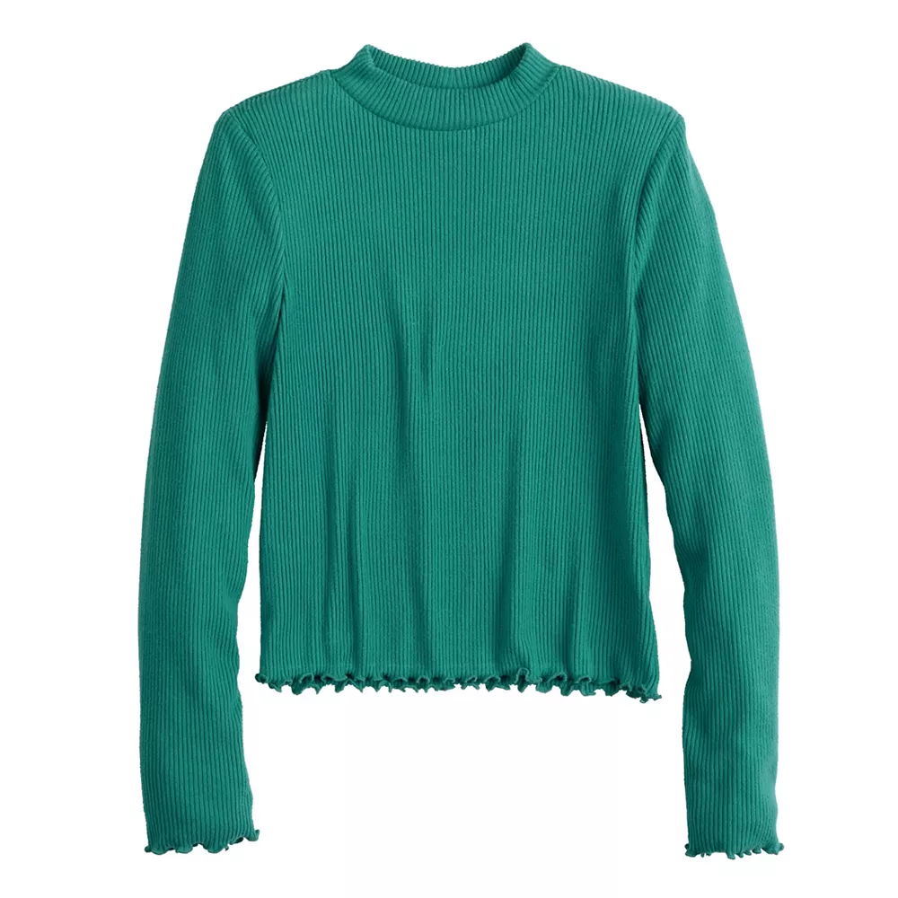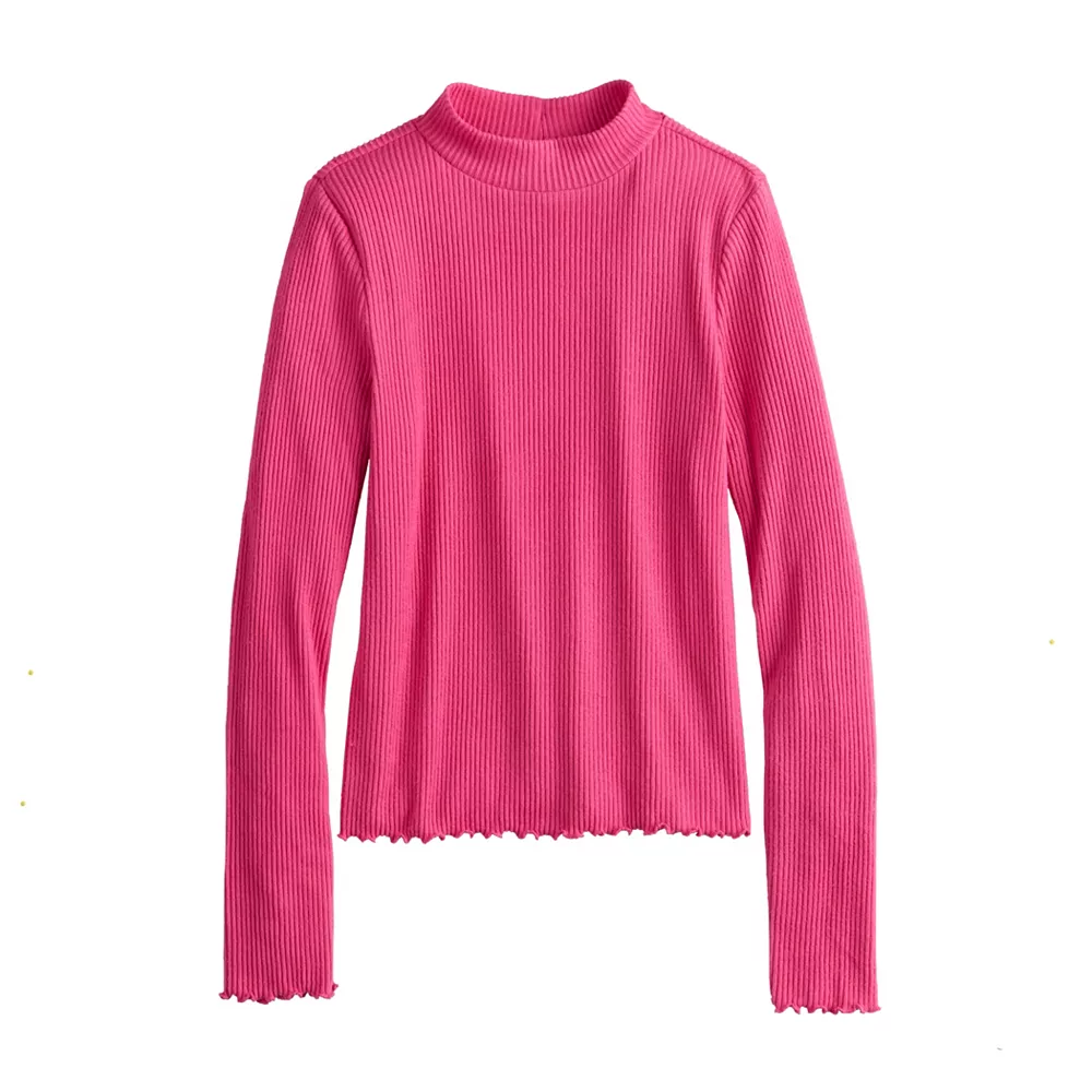 An eye-catching lettuce-edge hem and sophisticated mockneck design make this SO tee the perfect choice for your growing girl.