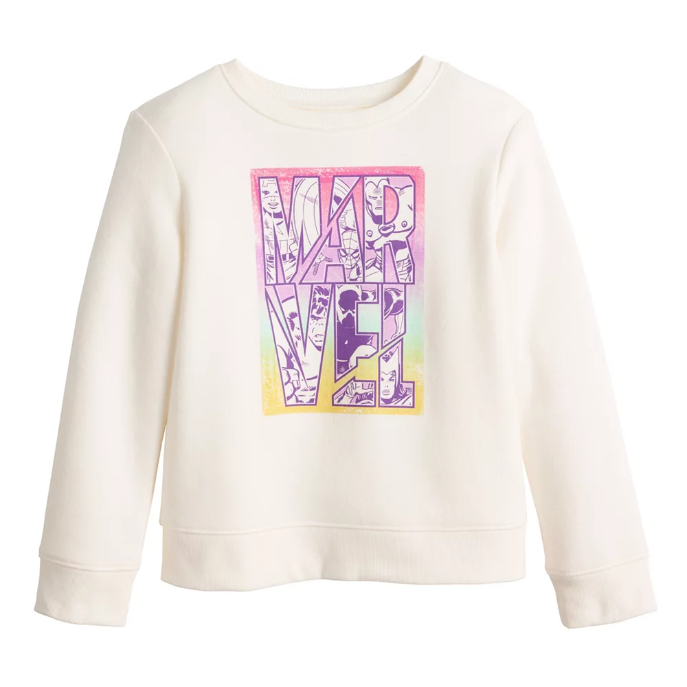 She’ll feel like a super hero with this girls’ Jumping Beans Marvel pullover sweater.